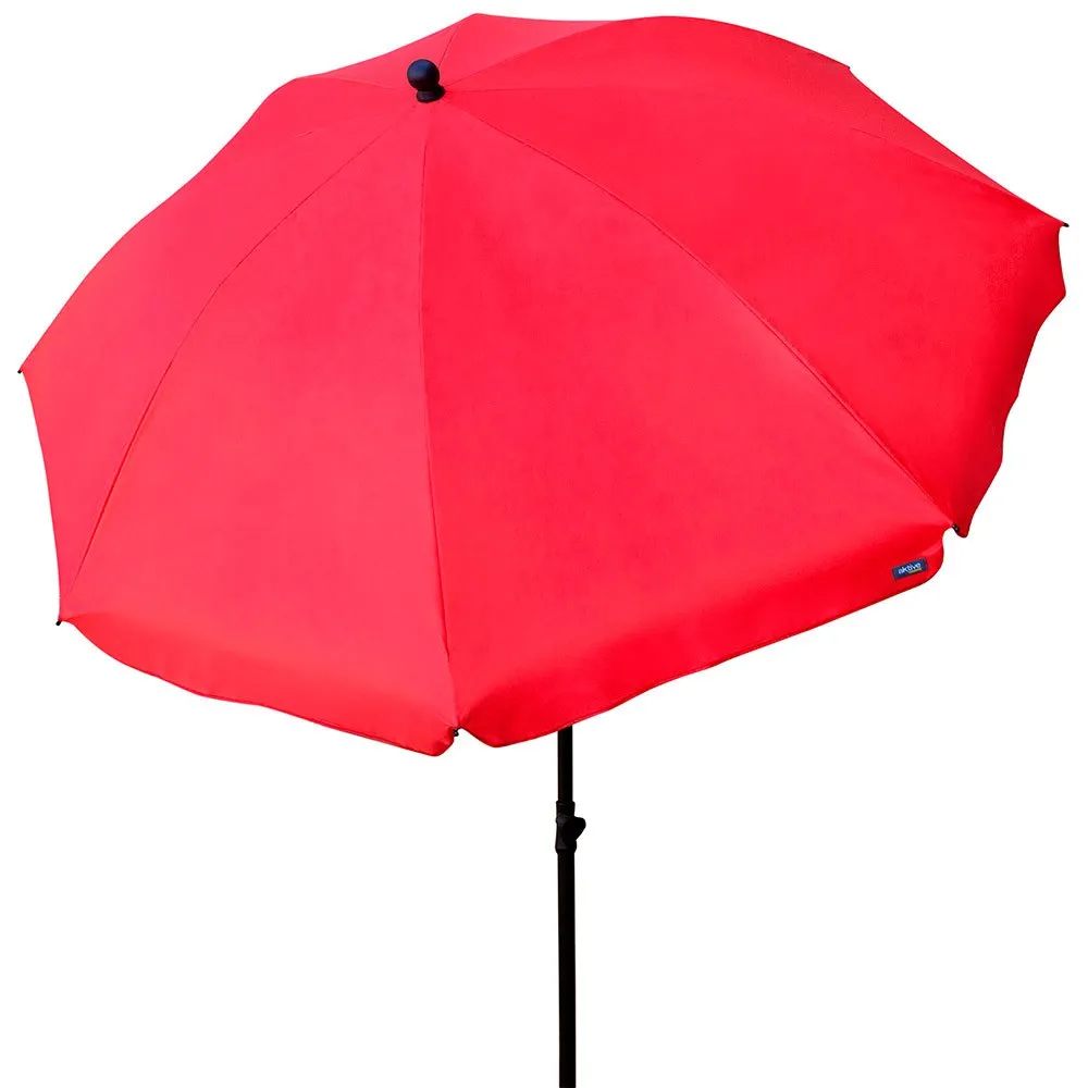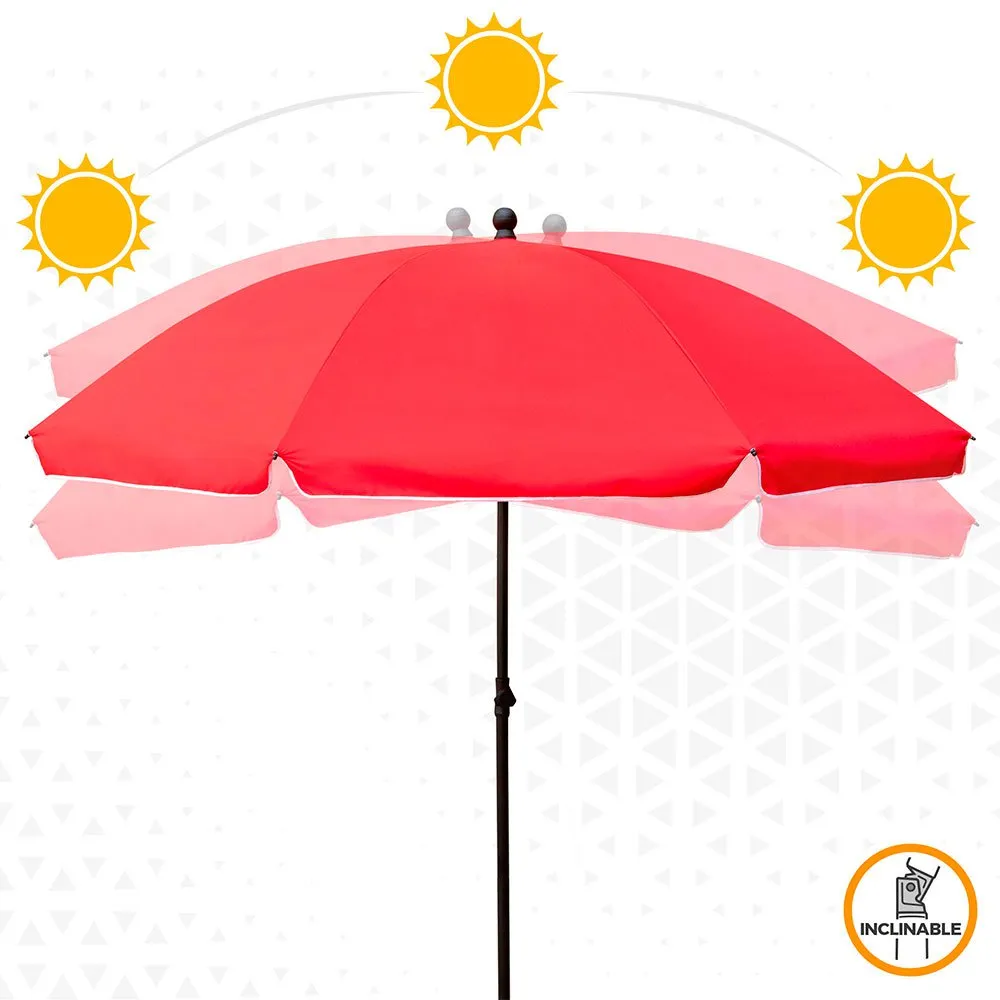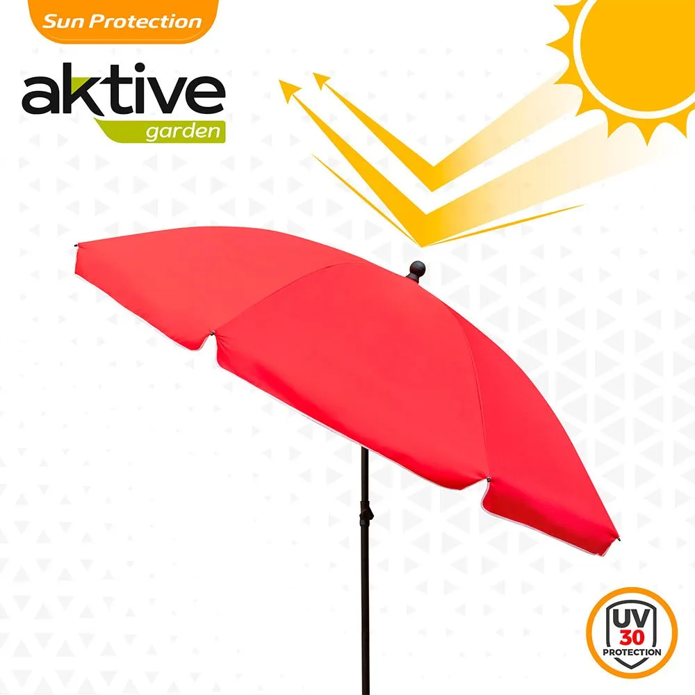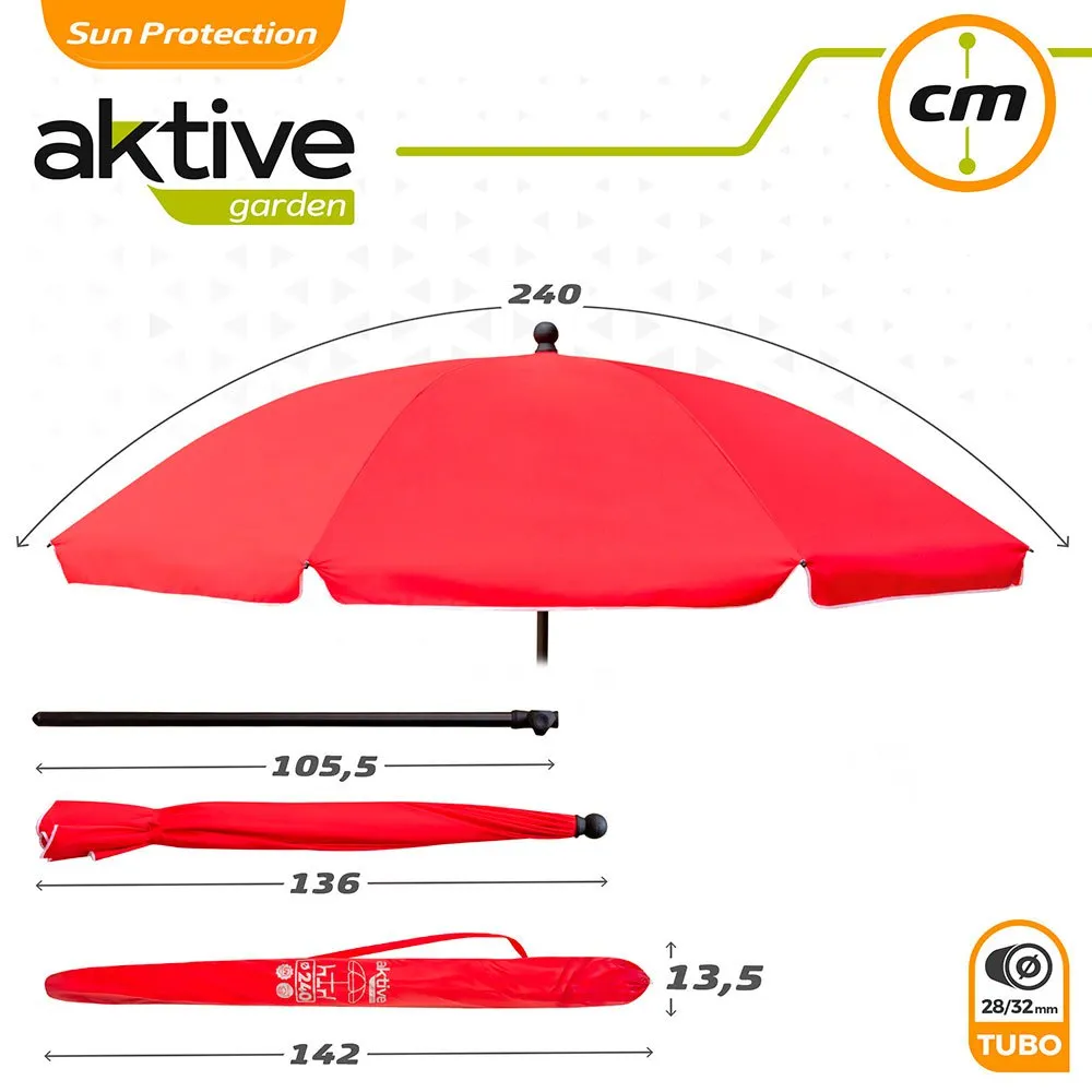 Umbrella with UV filter from Aktive Garden. Garden umbrella made of red polyester and measures 240 cm arch and 2.3 meters maximum height. It has an aluminum coating to protect from UV30 rays. The aluminum mast measures 28/32 mm, incorporates a thread to adjust the height and in the upper part it has a tilting system to direct the shade. This parasol has 8 ribs and can be easily opened and closed with the button. In addition, before and after use, it can be transported comfortably in the case with a handle that it includes. Characteristics and instructions for use High quality beach umbrella. Octagonal shape. White tubes with a diameter of 28-32 mm. Parasol with 240 cm arch. Ventilation roof. red color Made of polyester material with UV30 protection. The awning is supported by 8 glass rods. Flexible stick to guide the shadow. Adjustable height. Includes carrying bag with handle. Easily cleans with a damp cloth. Protect yourself from the sun safely with Aktive Garden.