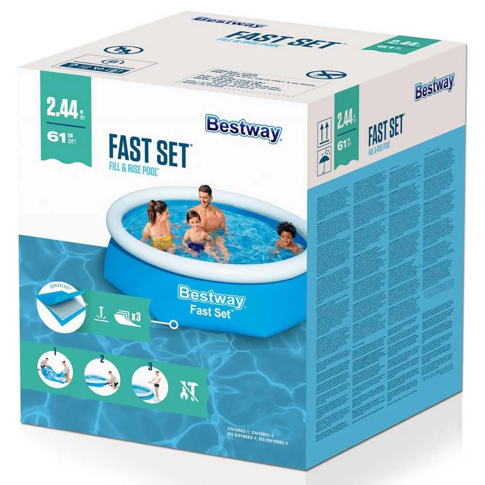 With this quick and easy Bestway Fast Set Pool Set, you’ll be ready for a pool day in no time! The Fill & Rise set-up process is simple – just select a level surface, inflate the top ring and the pool will rise as it’s filled up with water. The sturdy Dura Plus liner is made out of an ultra-durable 3-layer material that is reinforced for strength and is 85% more puncture-resistant than PVC. When the season’s over, storage is fast and simple. The water releases easily through the flow control drain valve, and then the pool can fold up for compact off-season storage. This pool is the ideal choice for families looking for a quick and easy pool option for their backyard. Kids will enjoy spending their summer days splashing and playing in the water, and parents can enjoy a nice and relaxing dip as well. The season won’t be complete without the convenient Fast Set Pool from Bestway