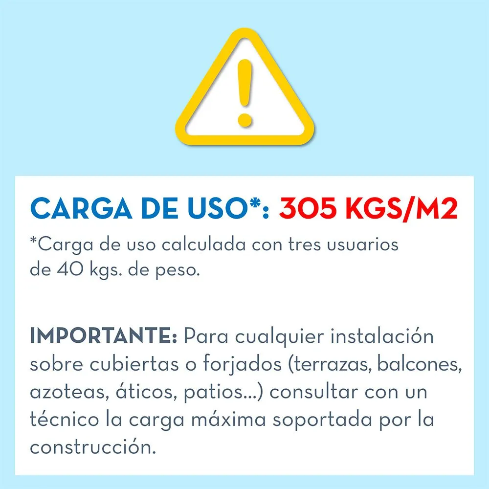 The inflatable pool holds a maximum weight of 81 Kg and has a maximum capacity of 493 litres of water (fill up to 20 cm high).