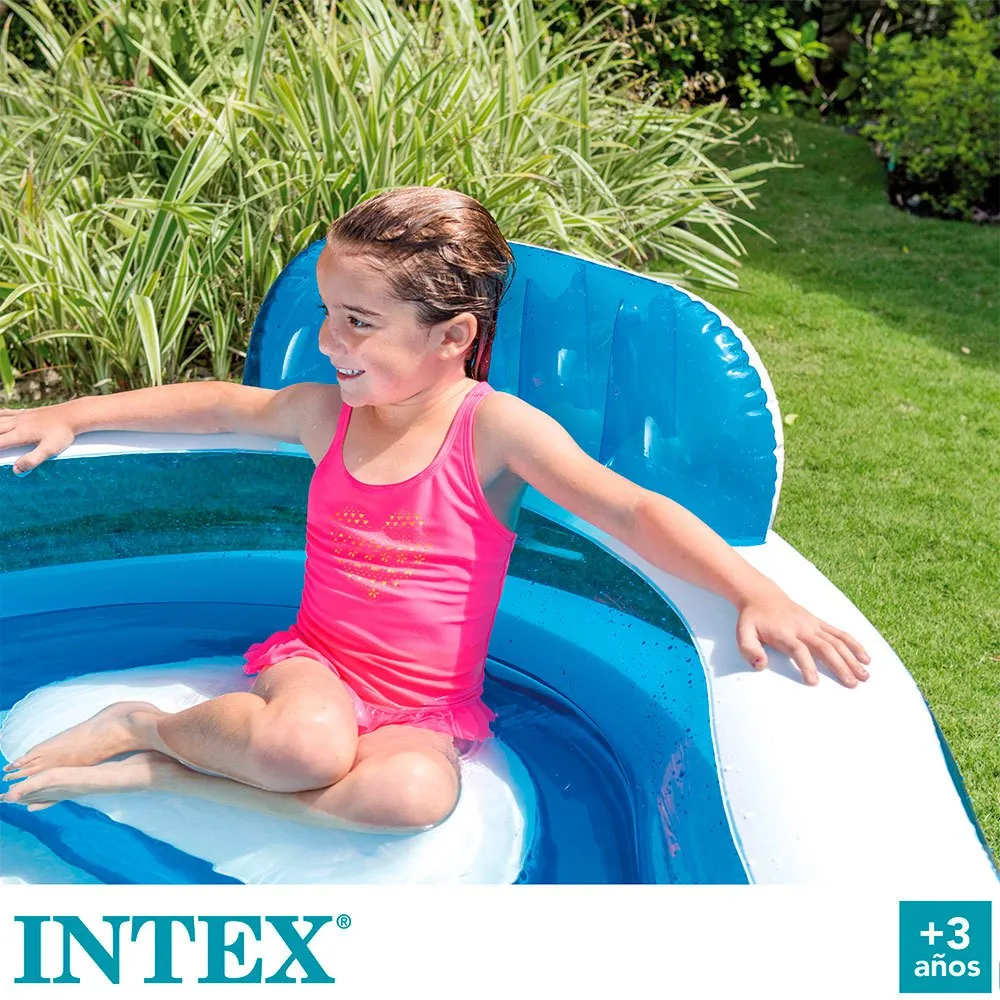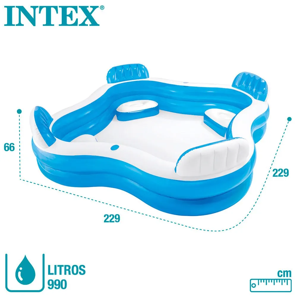Inflatable swimming pool with 4 inflatable seats for comfort and relaxation.