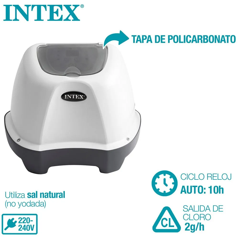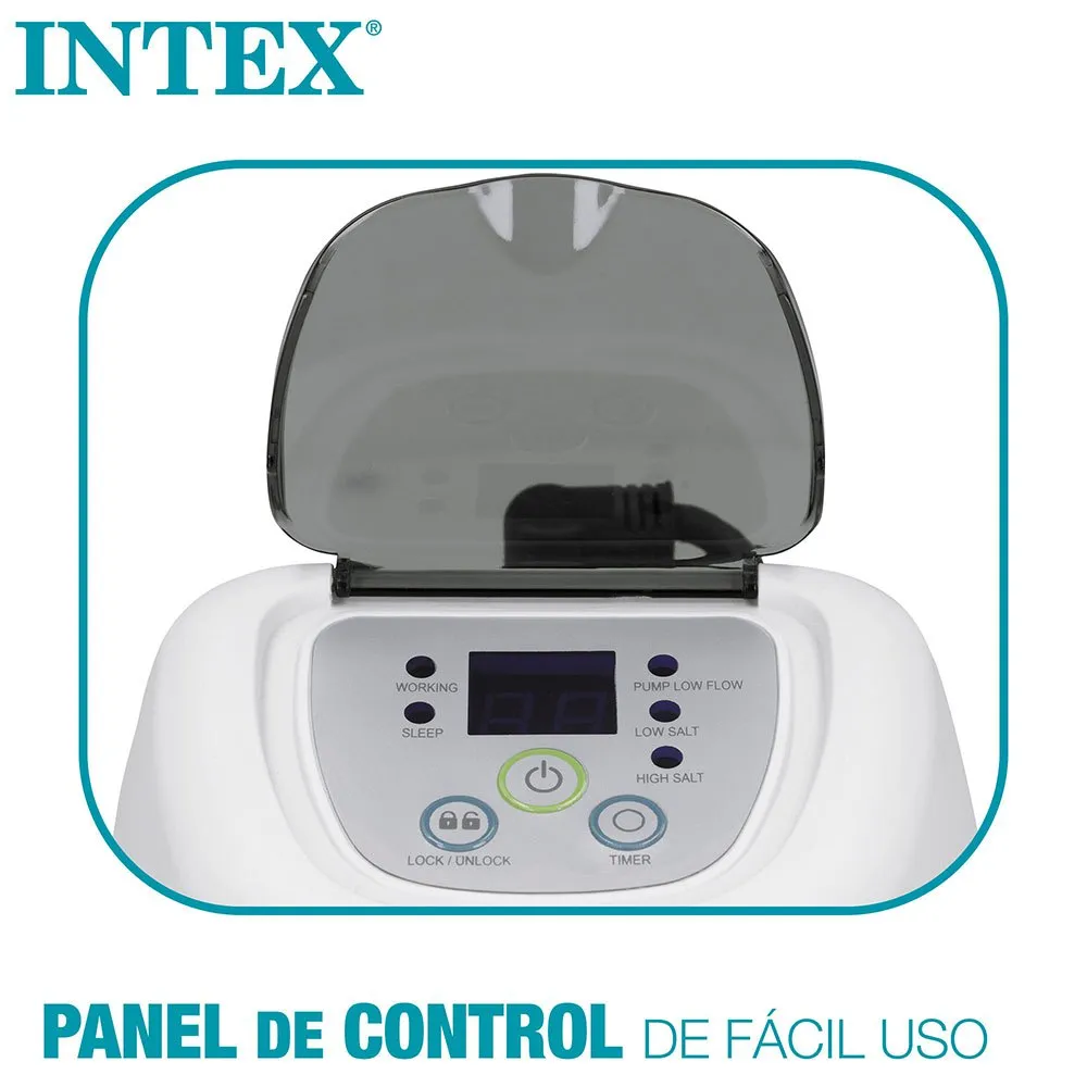 It works with iodized salt and is ideal for maintaining the water in INTEX removable pools of up to 8,327 liters, being compatible with small rectangular or round pool models of up to 3.66 m.
