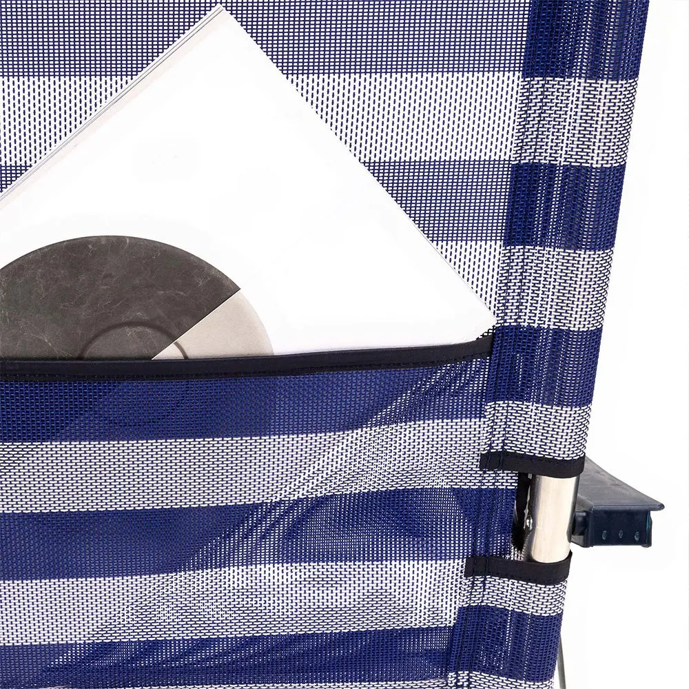 Beach chair-bed, aluminum tube, textiline, with back pocket, with handles, and with height adjustable head.
